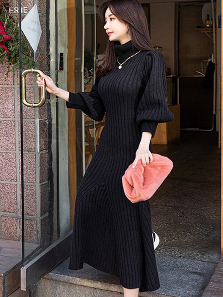 【ベルト付き】ハイネック ニットワンピース ランタンスリーブ スリムニットドレス セータースカート フィッシュテールスカート 2カラー a2216
