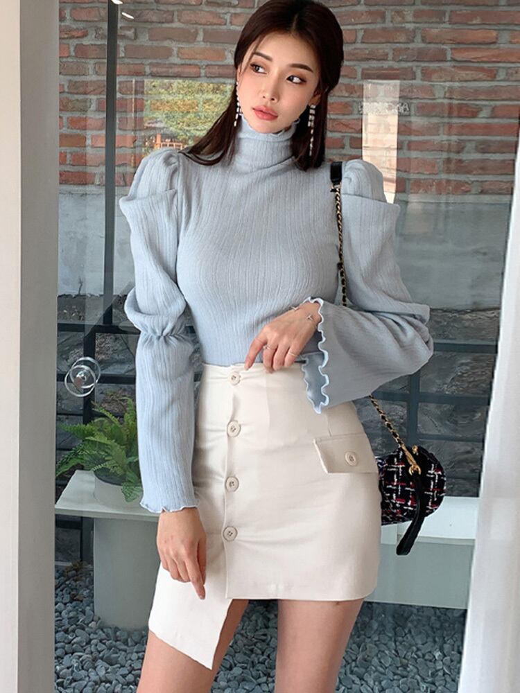 【セットアップ】ハイネックトップス+アシメントリースカート トランペットスリーブ 秋冬 スーツスカート ツーピース a2223