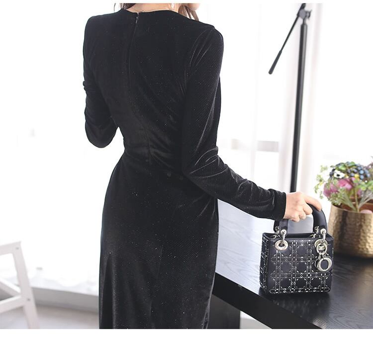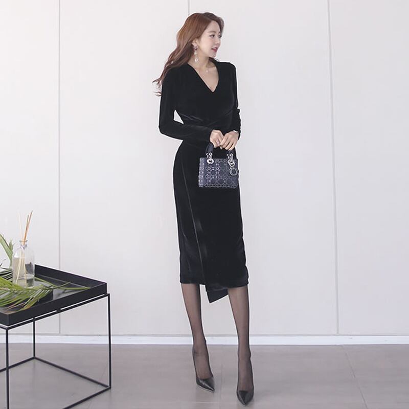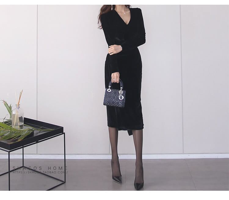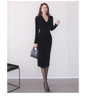 Vネックベルベット長袖ドレス ウエストスリム ヒップスカート ベルベット 秋冬 韓国 a2249