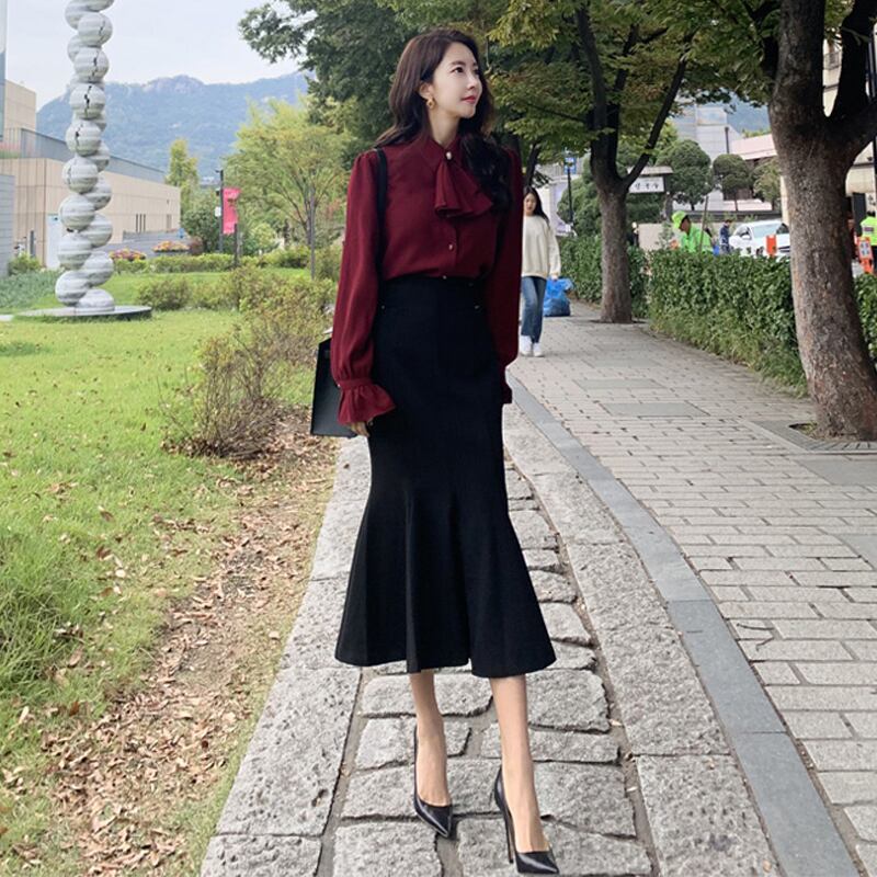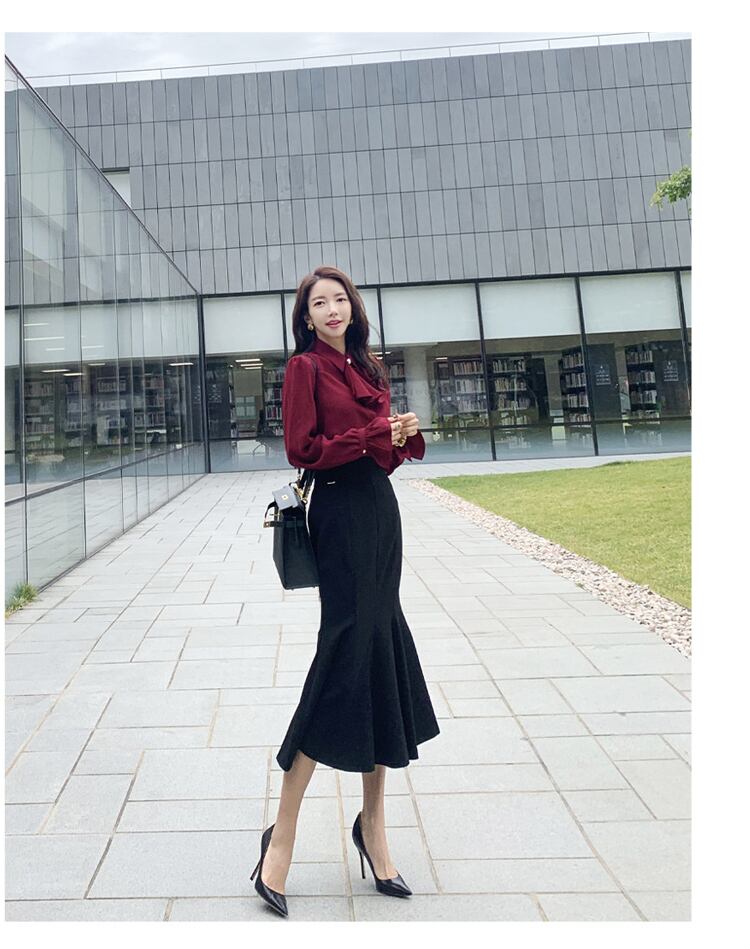 【セットアップ】ボウタイ付きシャツ+フィッシュテールスカート ハイウエスト スリム 秋冬 韓国 OL ツーピース a2256