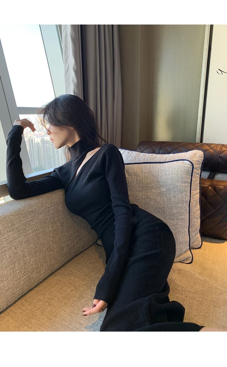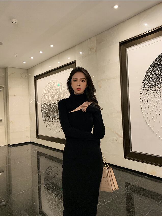 ブラックセクシーニットワンピース ハーフハイネック ニットドレス 秋冬 韓国 大人セクシー a2269