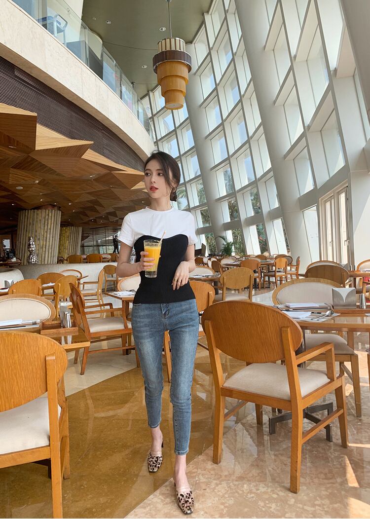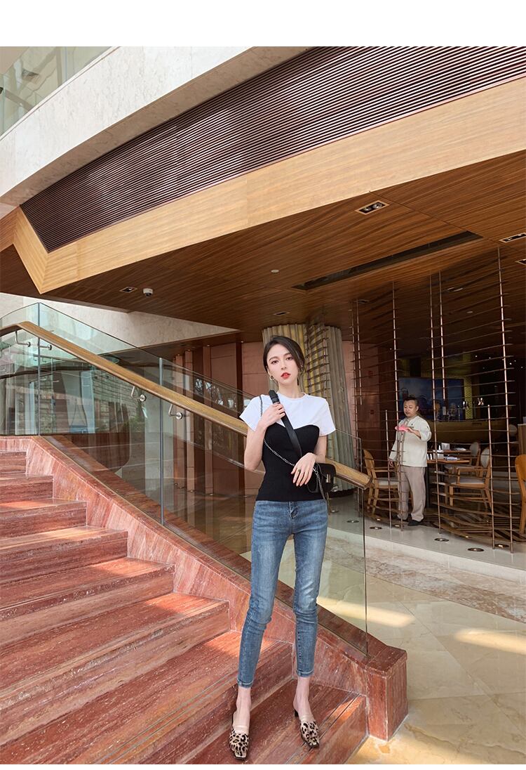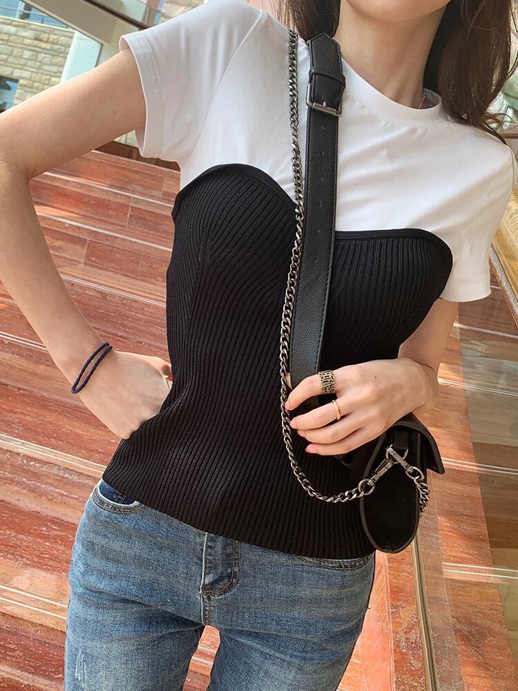 フェイクツーピース 半袖Tシャツ ラウンドネック コントラストカラー バイカラー ブラック×ホワイト 韓国 a2275