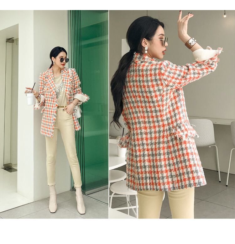 千鳥格子 ジャケット ウールブレザー ツイード柄 フリンジ ミドル丈 レディース 韓国 コート アウター a2312
