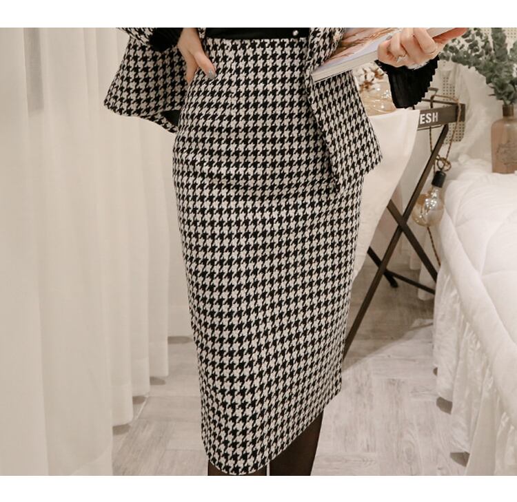 【セットアップ】千鳥格子柄 スーツジャケット+スリムフィットスカート ウールスーツ ツーピース レディース 秋冬 韓国 a2324