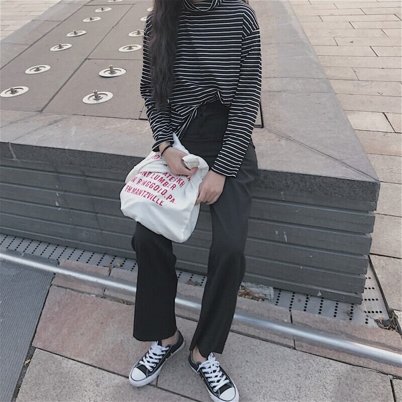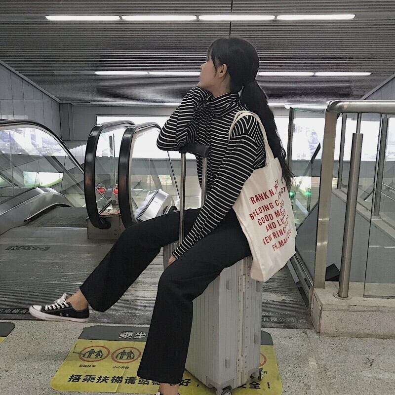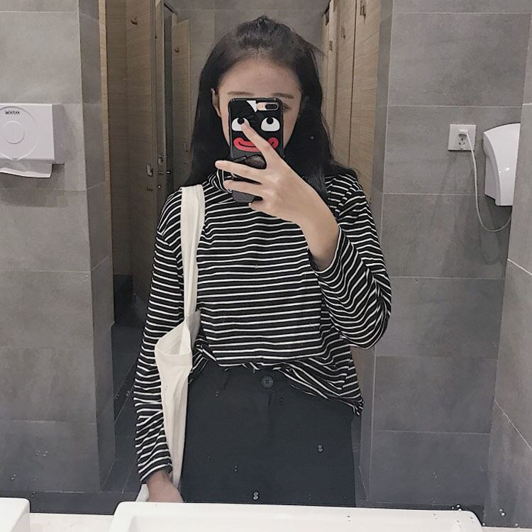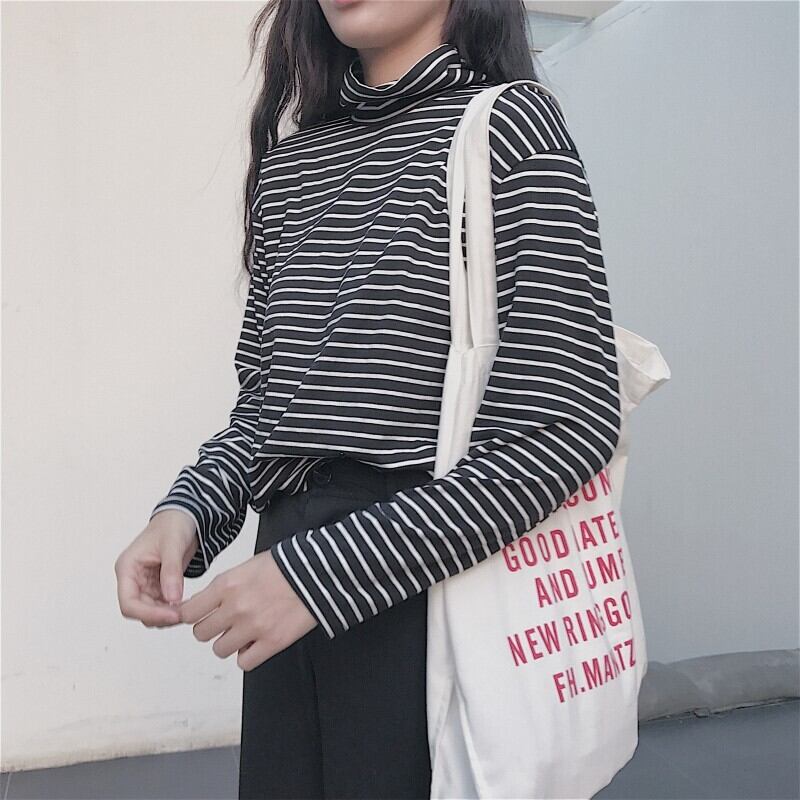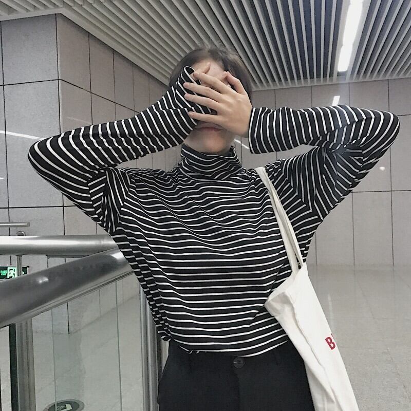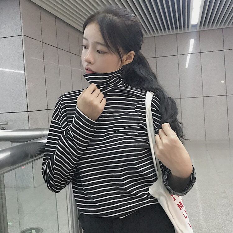 ストライプ長袖Tシャツ ボトミングシャツ ハイカラー タートルネック 秋冬 レディース 韓国 a2396