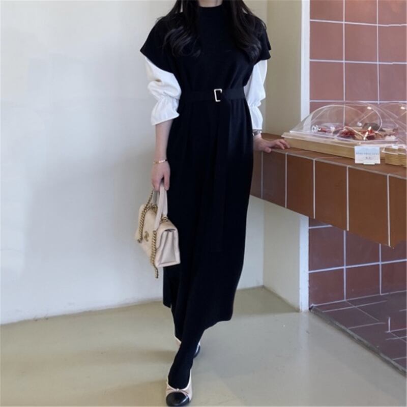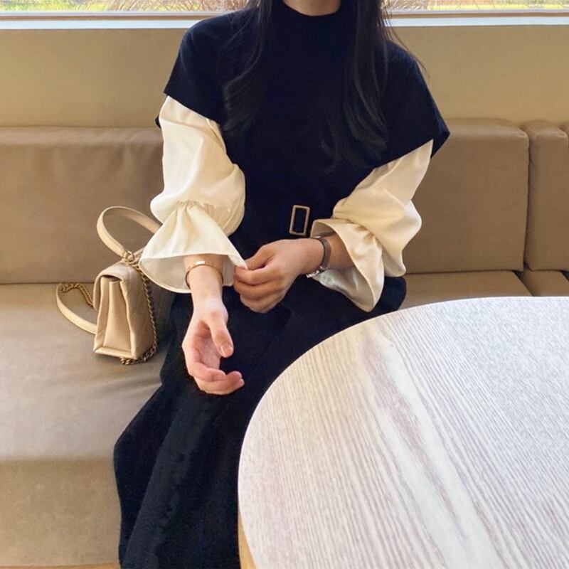 【セット】フレアスリーブシャツ+ハーフハイネックベストワンピース ニット ワンピース エレガント おしゃれ a2482