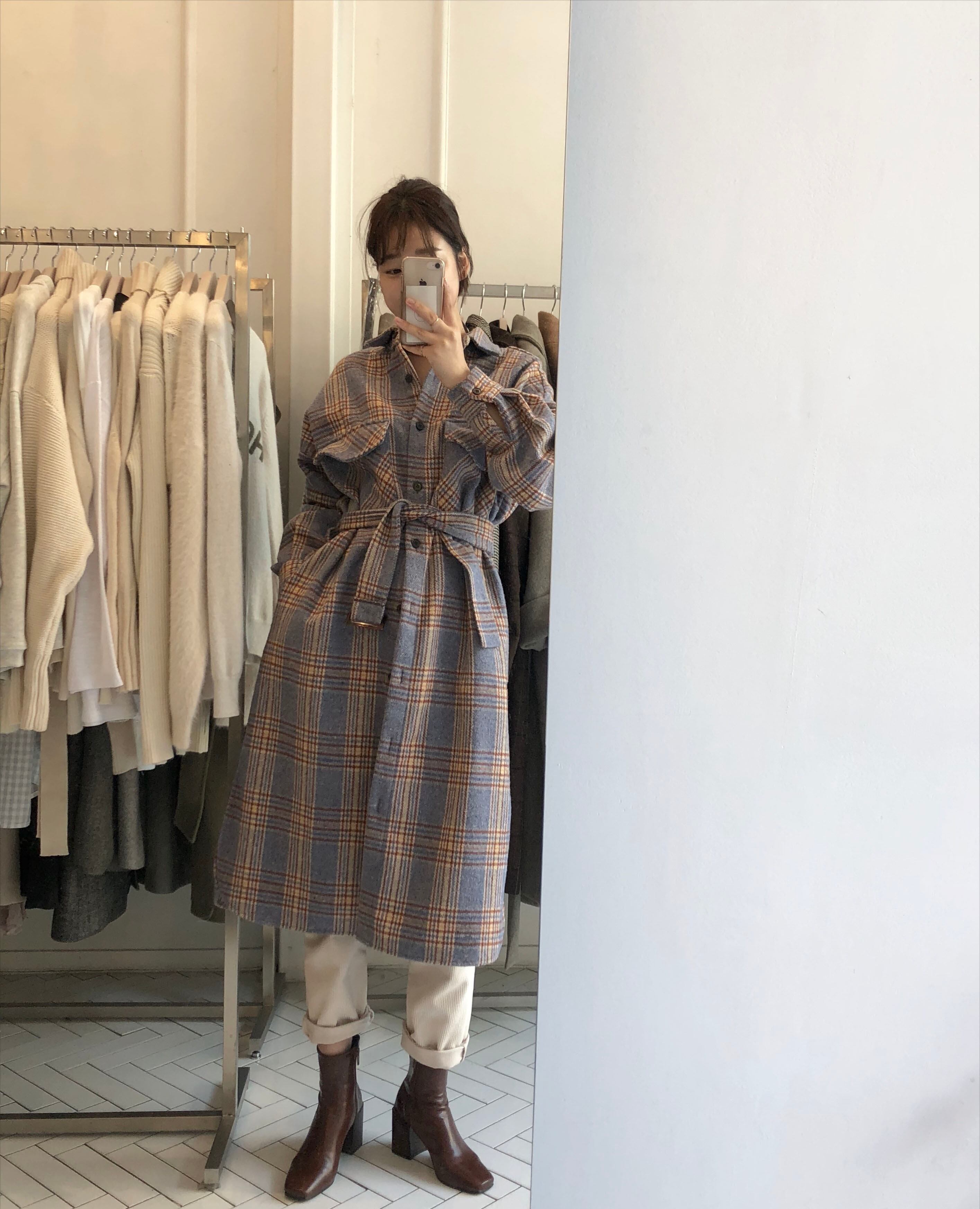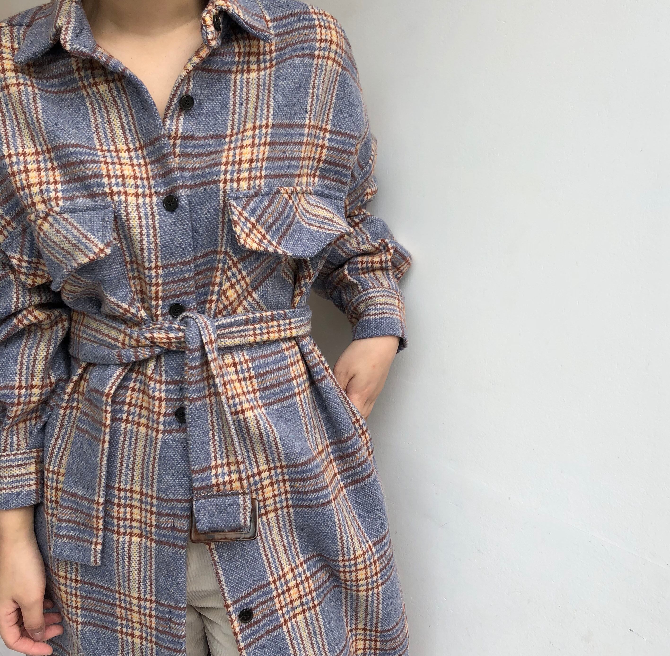 チェック柄 ルーズ コート シングルブレスト 韓国 シック レトロ ウエストベルト 2カラー a2531