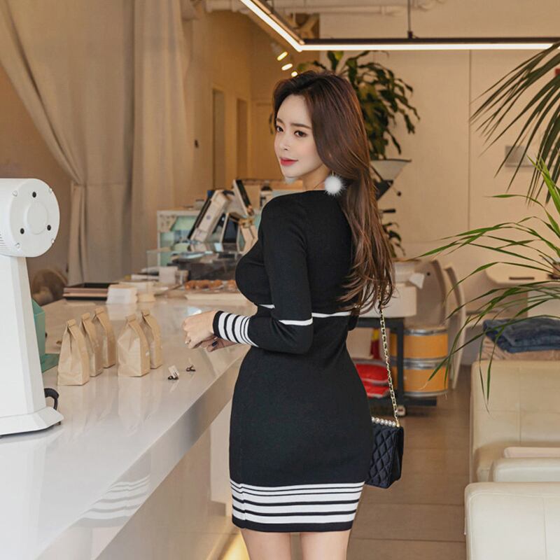 長袖スリムワンピース ストライプ バッグヒップスカート 韓国 セクシー ワンピース ミニ丈 2カラー a2533