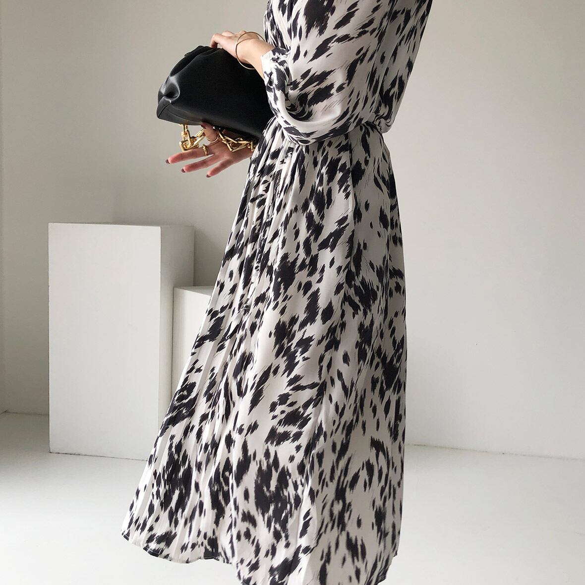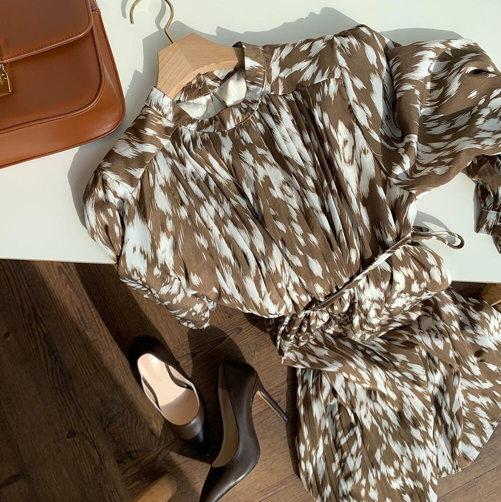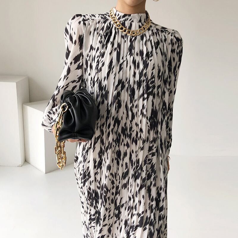 ダルメシアン柄プリーツワンピース ウエストストラップ ミドル丈 ドレス スタンドカラー 韓国 シック 3カラー a2565