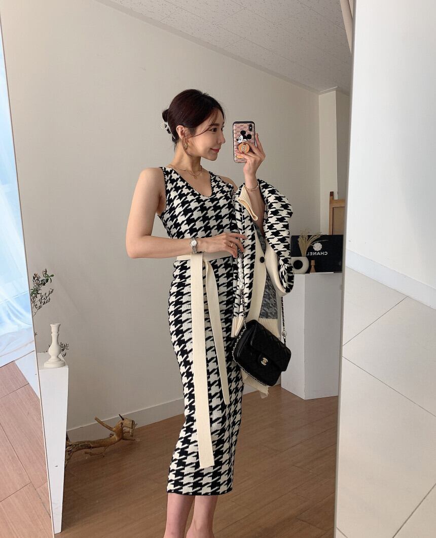 【セットアップ】千鳥格子柄ワンピース+Vネックカーディガン
