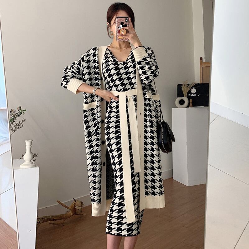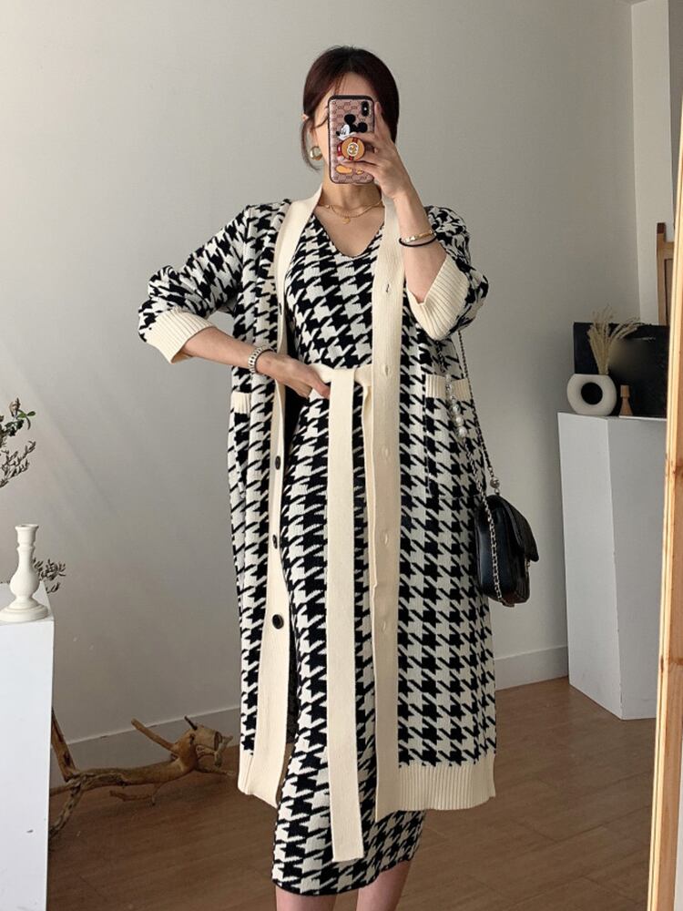 【セットアップ】千鳥格子柄ワンピース+Vネックカーディガン ルーズ エレガント 韓国 ツーピース a2579