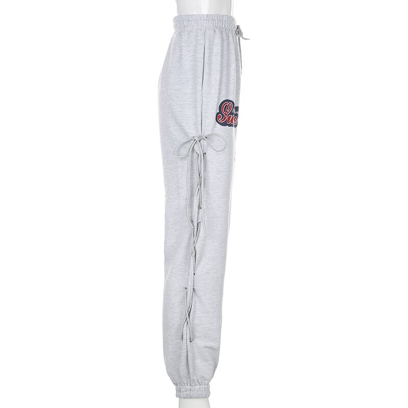 ポップな英字ロゴにサイドのレースアップがオシャレなカジュアルパンツ