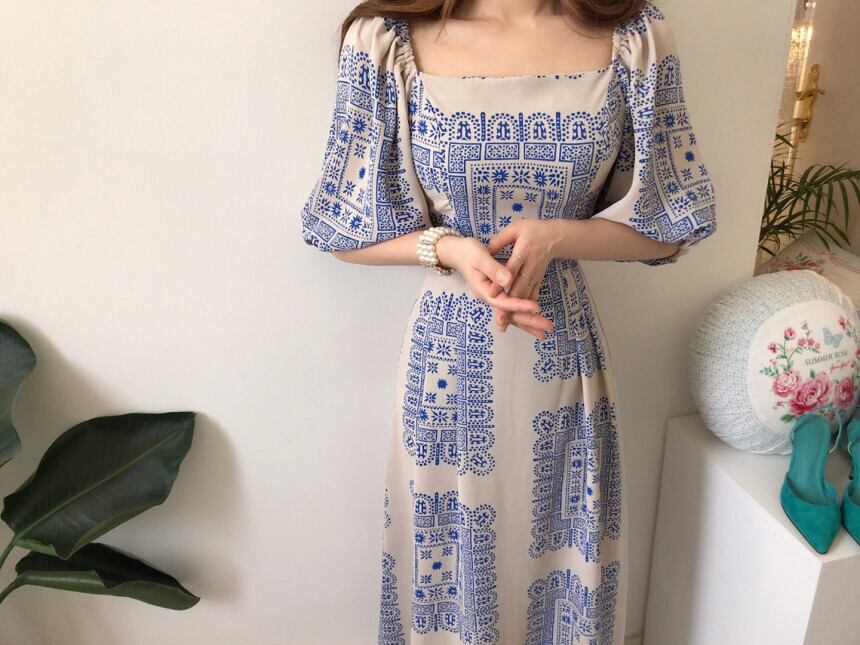 洋風プリントワンピース スクエアカラー ランタンスリーブ ドレス ロングスカート ハイウエスト 韓国 シック 鎖骨美人 a2631