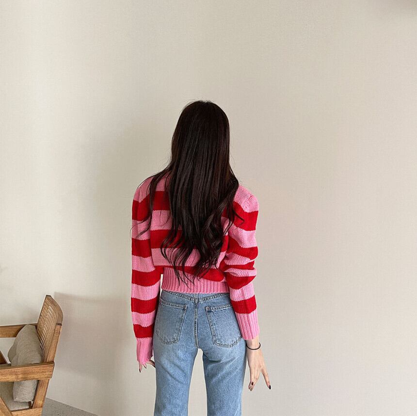 ストライプ長袖ニットセーター ボタンデザイン ポロカラー ルーズ ニットセーター 韓国 シック 2カラー a2638