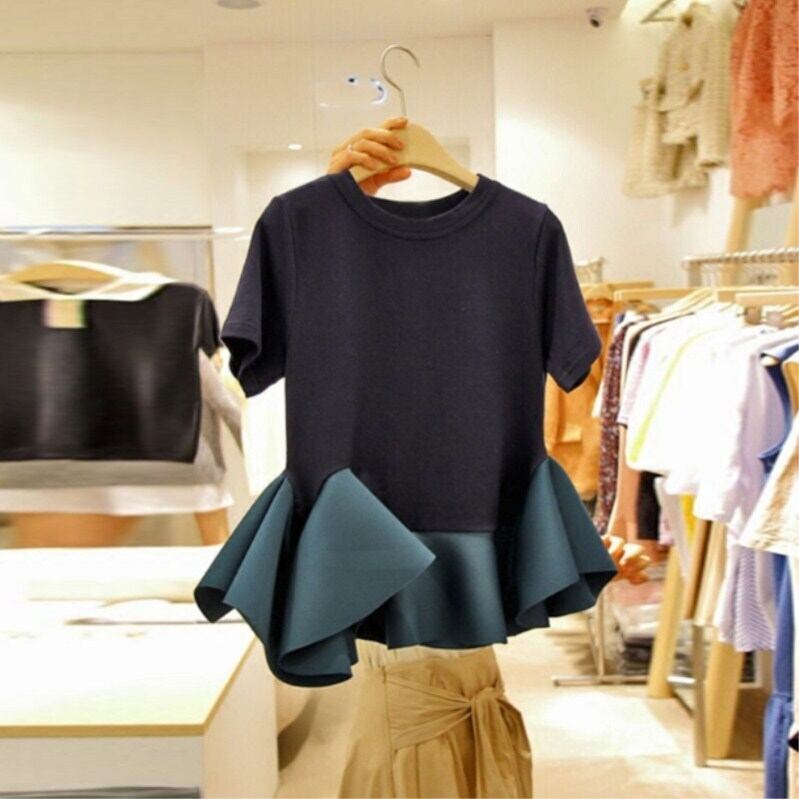 不規則フリル裾ショート半袖Tシャツ トップス ラウンドネック ルーズ 春夏 韓国 2カラー a2647