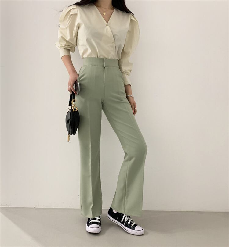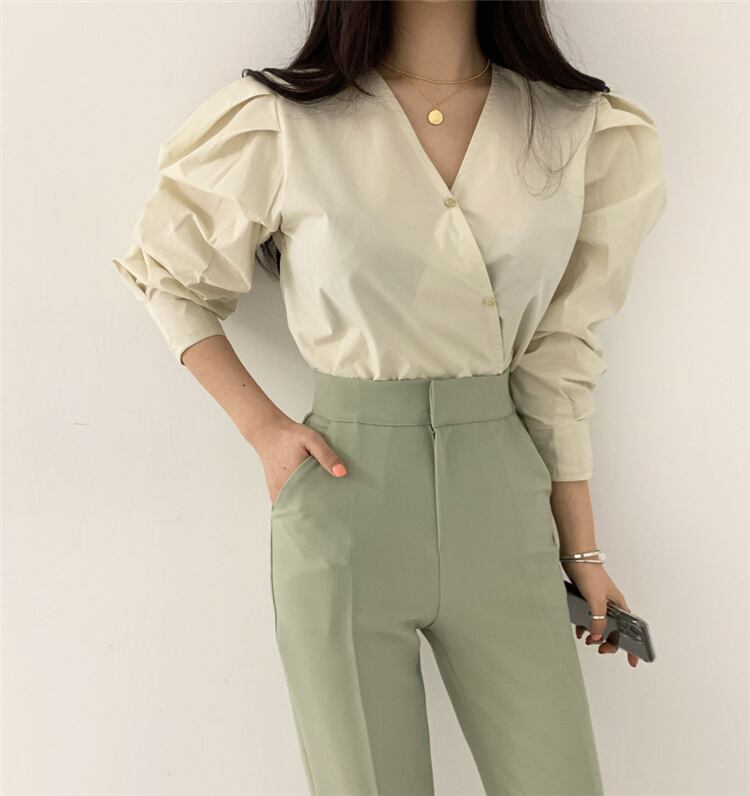 パフスリーブブラウス Vネック シャツ ブラウス クロスシングルボタン ニッチ 春 夏 秋 韓国 シック a2652