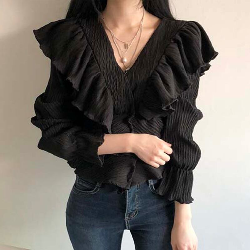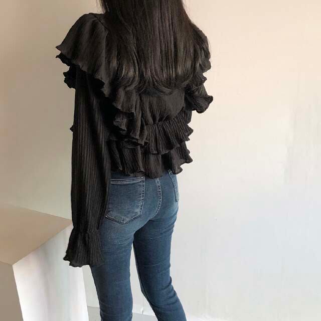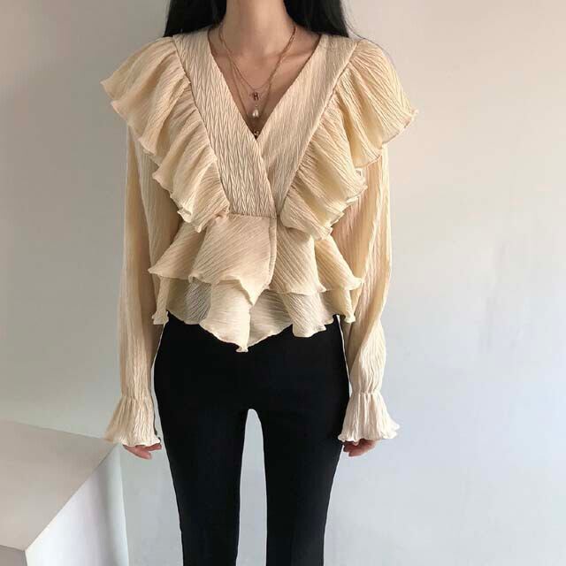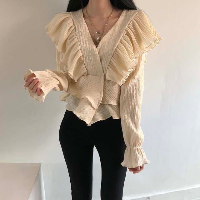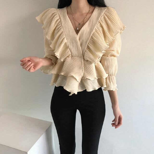 Vネックフリルブラウス シャツ フリルステッチ ハイウエスト フレアスリーブ シャツ トップス 韓国 シック 2カラー a2656