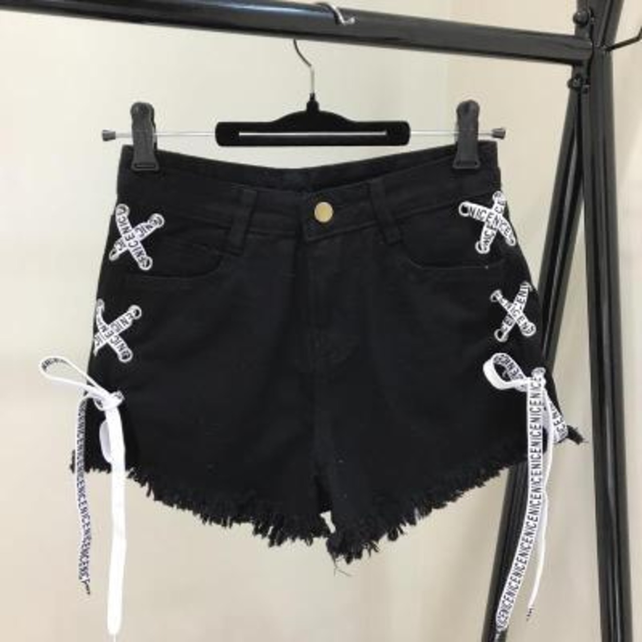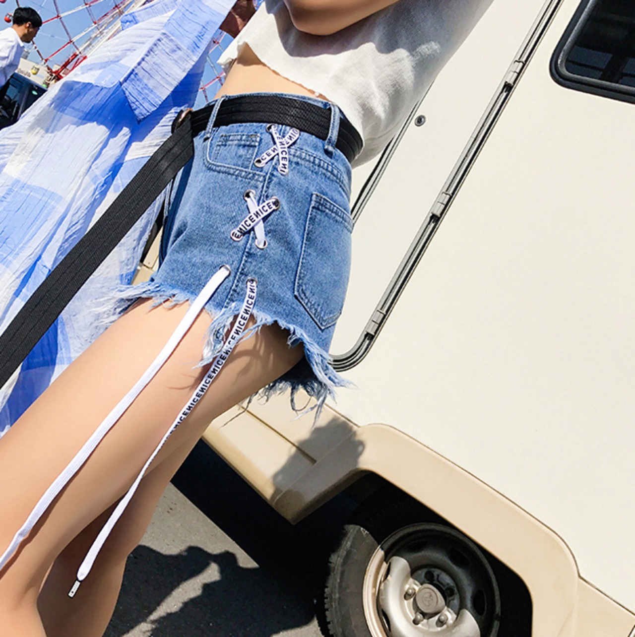 ショートデニムパンツ サイドレースアップ ハイウエスト ワイドレッグパンツ ルーズ 韓国 3カラー a2674