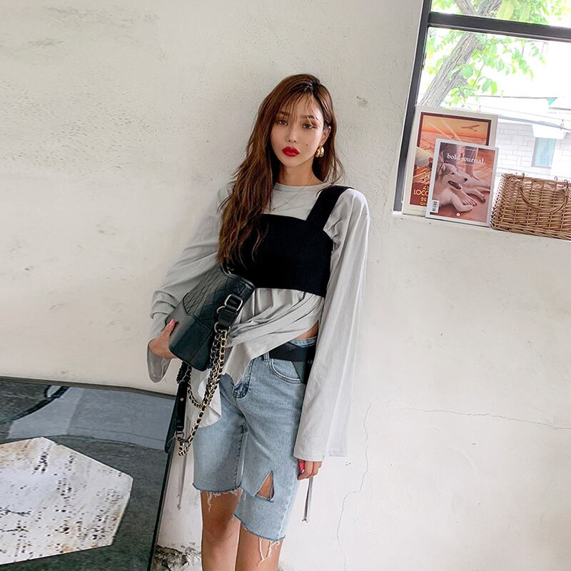 ダメージハーフデニム ハイウエスト 切りっぱなし ハーフパンツ タイト パンツ デニム 2カラー a2684