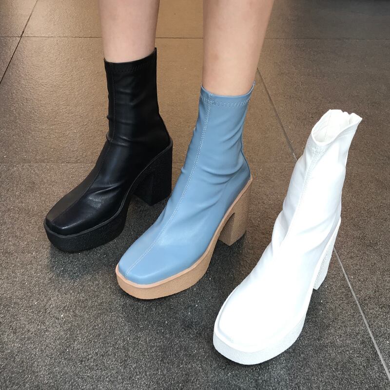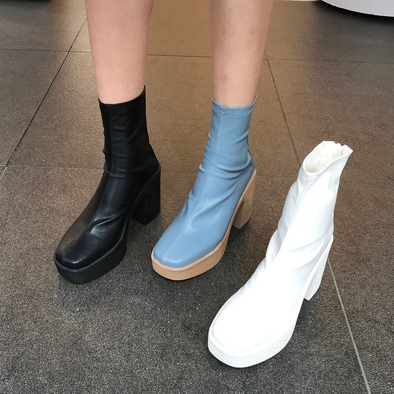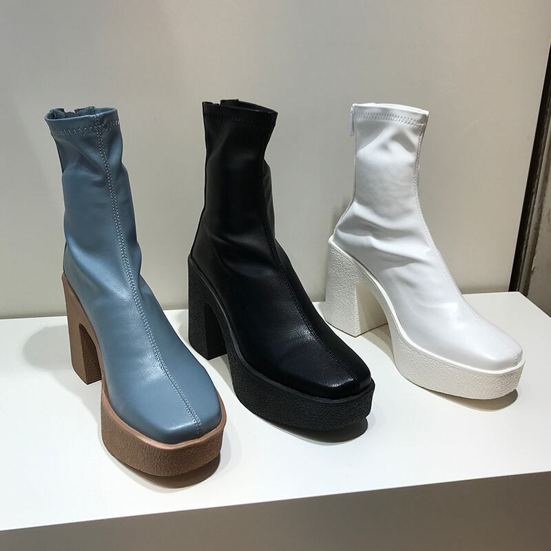 厚底ブーツ ミドル丈ブーツ ショートブーツ バックジッパー ハイヒール スクエアヘッド ラバーヒール 3カラー a2700