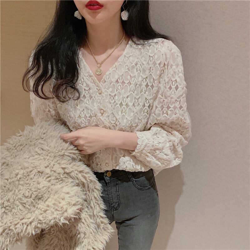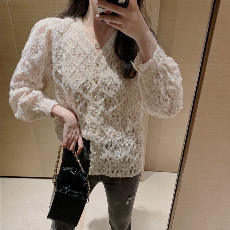 Vネックレースブラウス メッシュレースシャツ レディース Vネックカーディガン トップス 韓国 オルちゃん 春秋 a2693