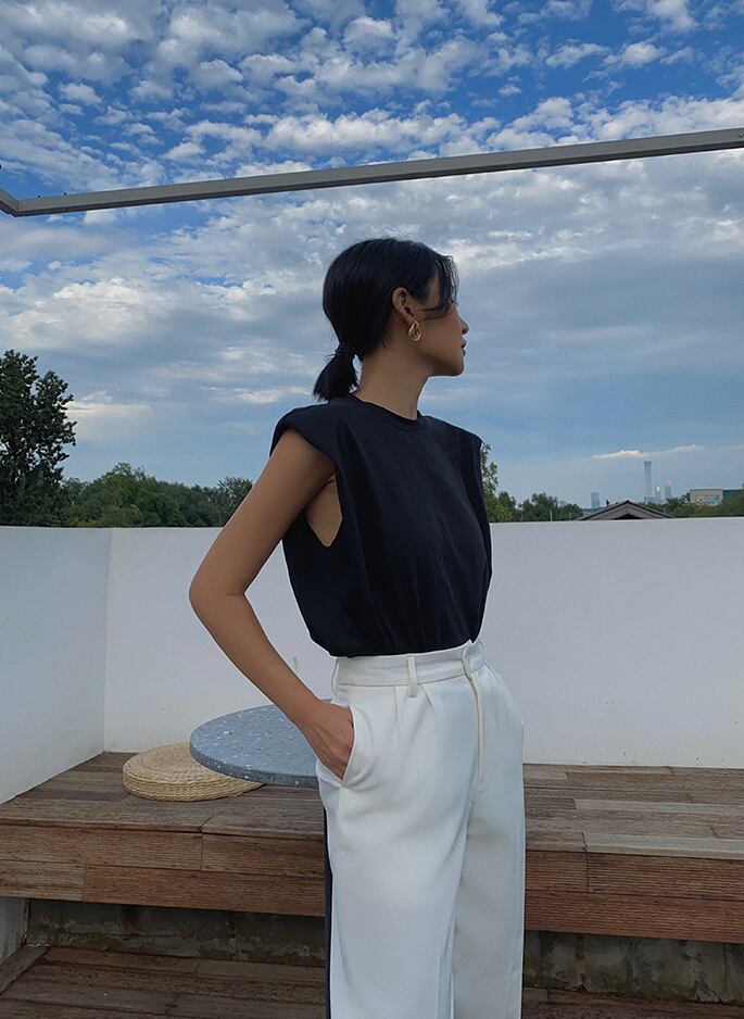 ノースリーブ ルーズ Tシャツ トップス ショートトップス ノースリーブベスト 直角ショルダー ラウンドネック カジュアル ストリートファッション アメカジコーデ 2カラー a2781
