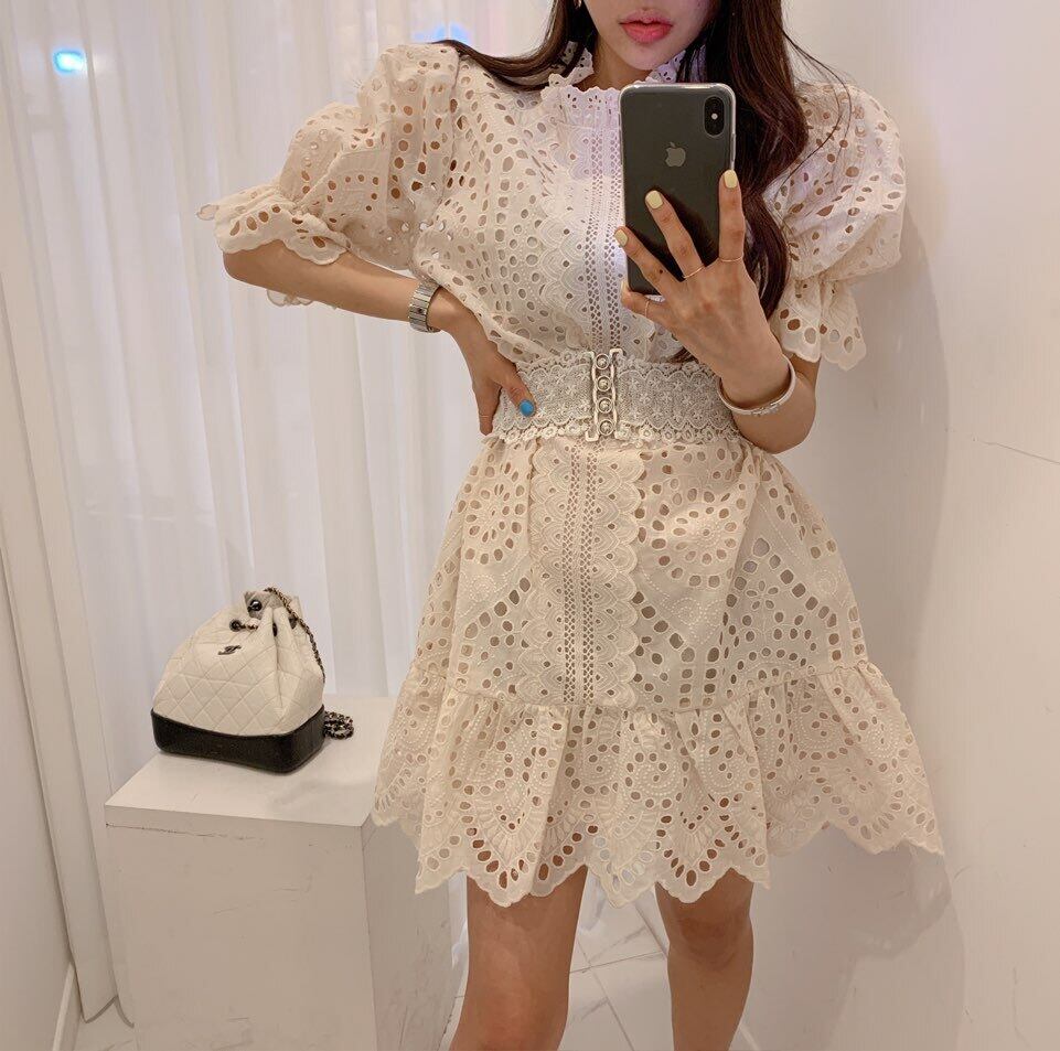 【ベルト付き】パンチングレース Aライン ワンピース ドレス フィッシュテール マーメイド スタンドカラー レースワンピ 膝上 韓国 可愛い エレガント デートコーデ. a2884