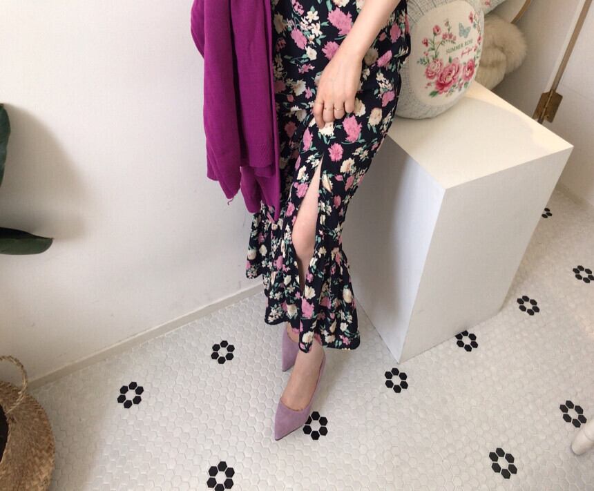 Vネック フラワーワンピース シフォン ワンピース ドレス 半袖 スリム 花柄 韓国 シック レトロ エレガント ロングスカート a2902