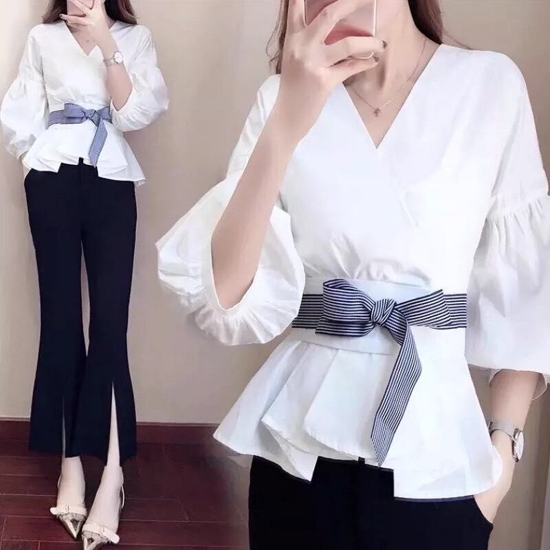 Vネック ストライプペプラムシャツ ストライプシャツ シャツ ブラウス ストライプ ウエストリボン ランタンスリーブ a2917