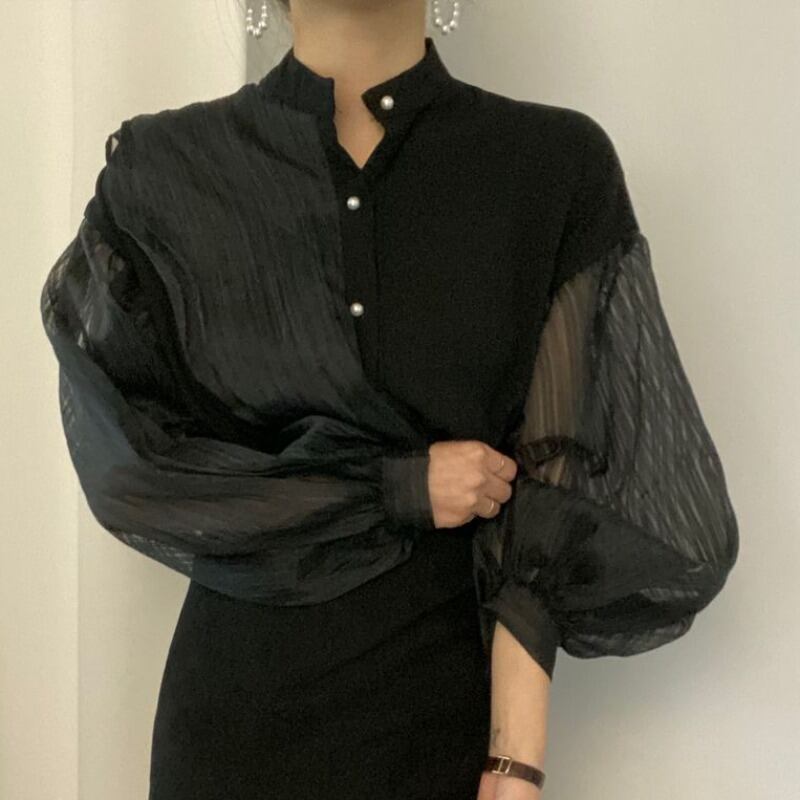 フリルメッシュステッチシャツ ランタンスリーブ アシンメトリー フェアリーブラウス シャツ ブラウス 韓国 オルチャン お仕事コーデ デートコーデ スタンドカラー 2カラー a2918