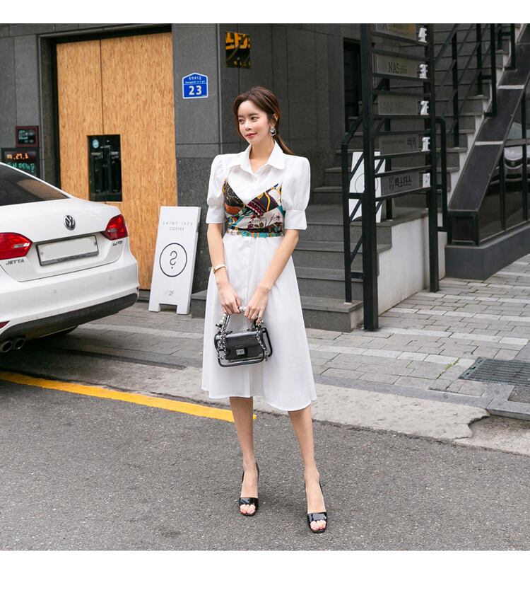 半袖シャツワンピース フェイクツーピース シャツワンピース ワンピース ドレス 半袖ワンピース ポロカラー ウエスト パフスリーブ Aラインスカート POLO襟 韓国 オルチャン お仕事コーデ デートコーデ 綺麗めコーデ a2920