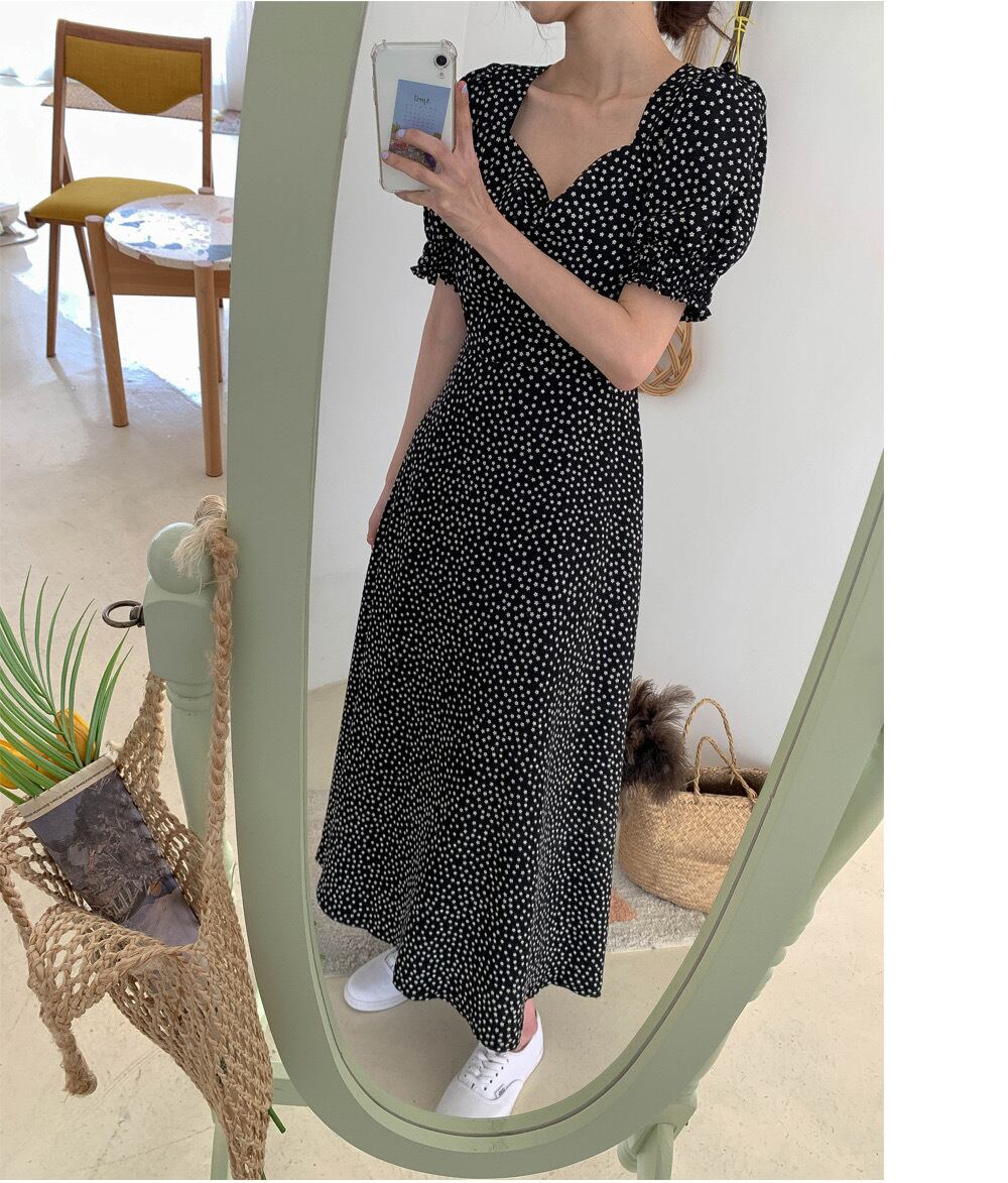 花柄ワンピース Vネック 半袖ワンピース ワンピース ドレス パフスリーブ Aラインスカート スクエアカラー ハイウエスト 韓国 オルチャン a2932