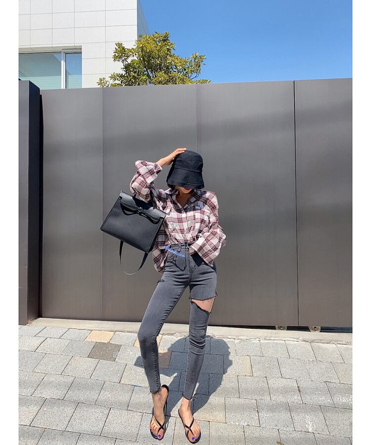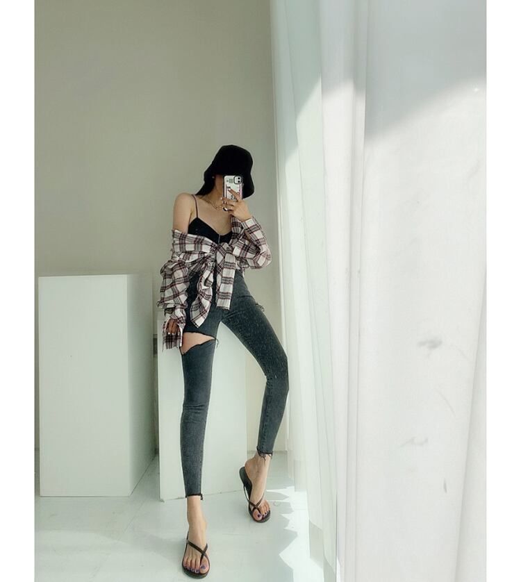 ダークグレー ダメージデニム ストレッチ デニム ジーンズ ハイウエスト スキニーデニム タイト フィット スリム 9分丈 切りっぱなし a2942