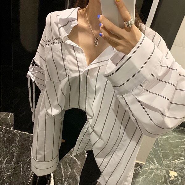 ストライプ長袖シャツ スリーブストラップ 長袖シャツ ルーズ イレギュラー ロングシャツ トレンド 韓国 a2993