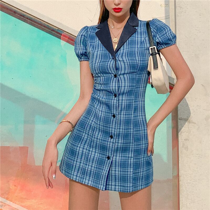 チェック柄 パフスリーブ ワンピース フレンチ レトロ ショートスカート レディース シングルブレスト スーツカラー ストリート アメカジ ブラックコーデ a3020