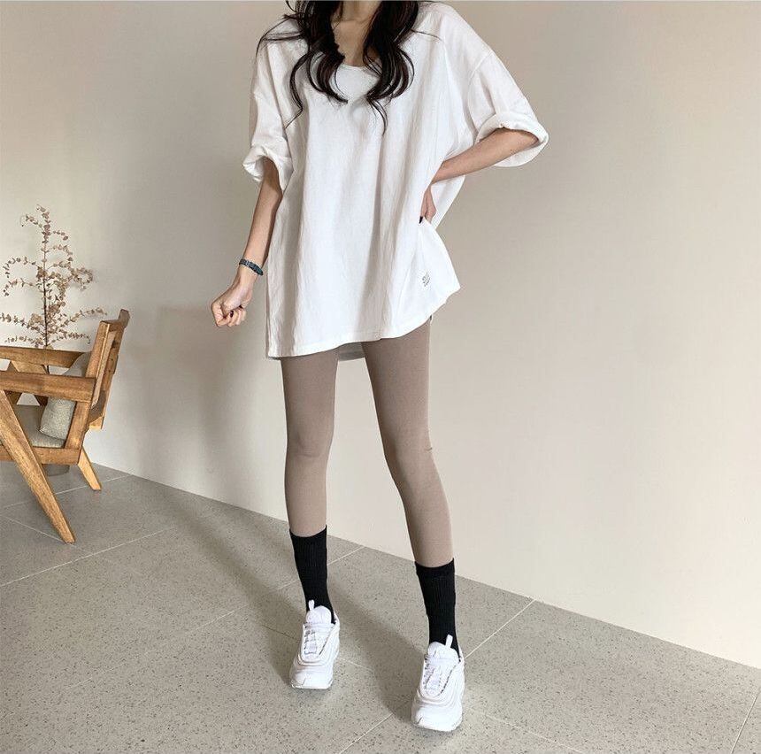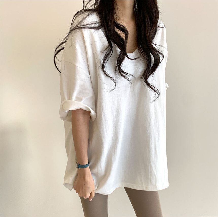 ワイルドUネック 半袖ボトミングTシャツ プルオーバー ルーズ 無地 サイドスリット 夏 シンプル 半袖Tシャツ ワイドTシャツ トップス 2カラー a3024