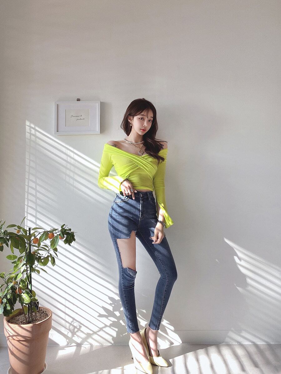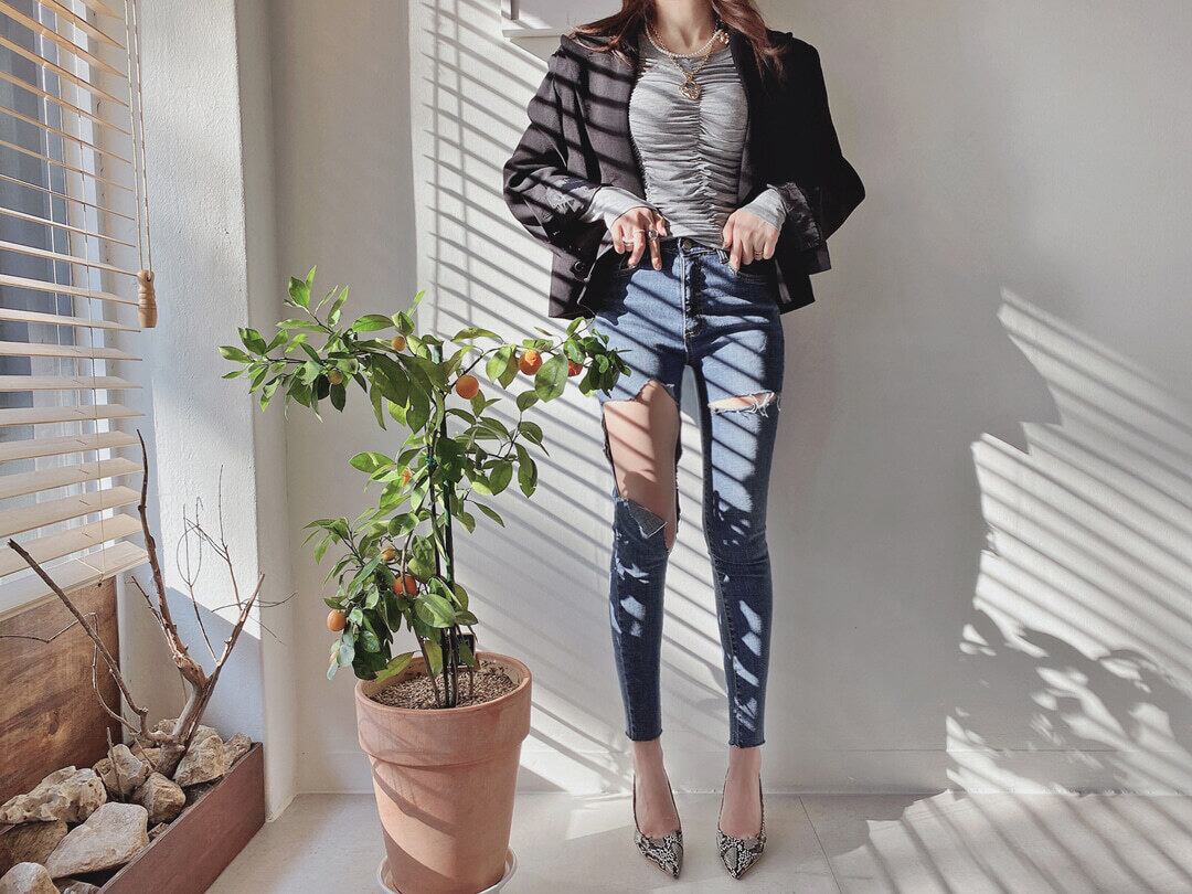 大胆に入ったダメージがオシャレなダメージスキニージーンズ
