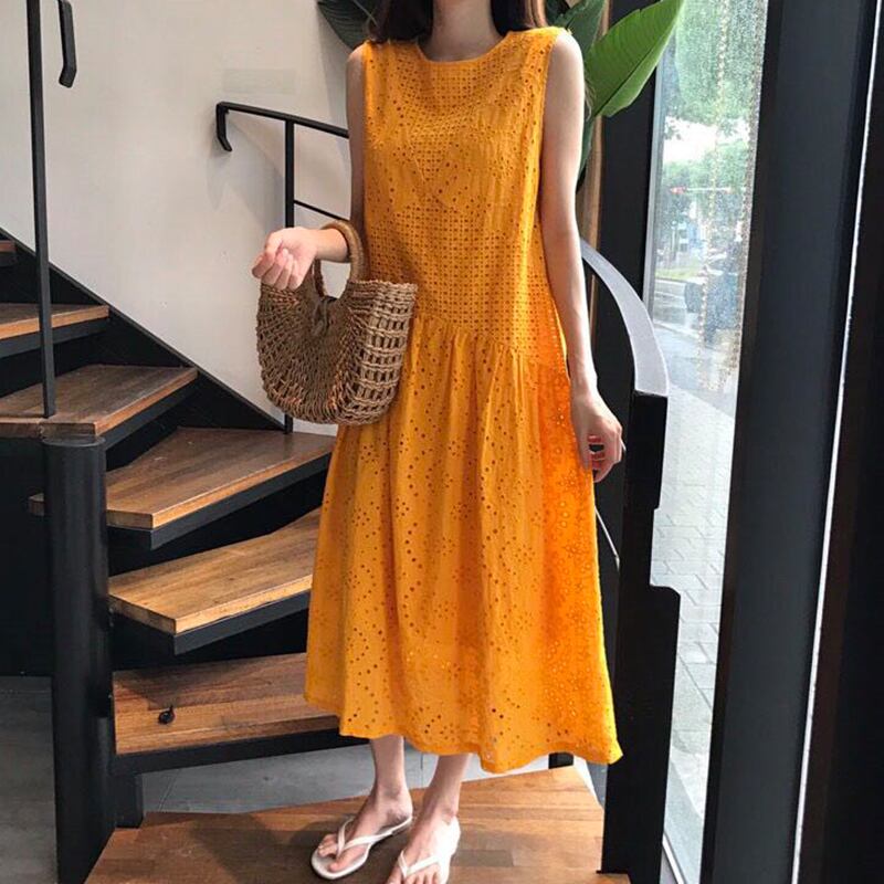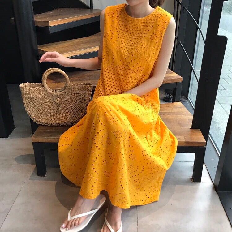 イエローレースワンピース ノースリーブワンピース ルーズ ドレス ロングスカート ワンピース 夏 薄手 パンチングレース ラウンドネック 韓国 エレガント a3034