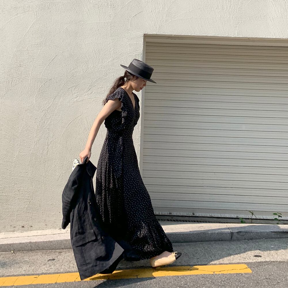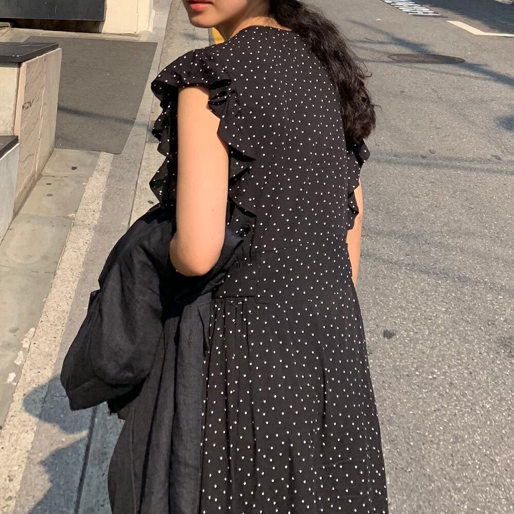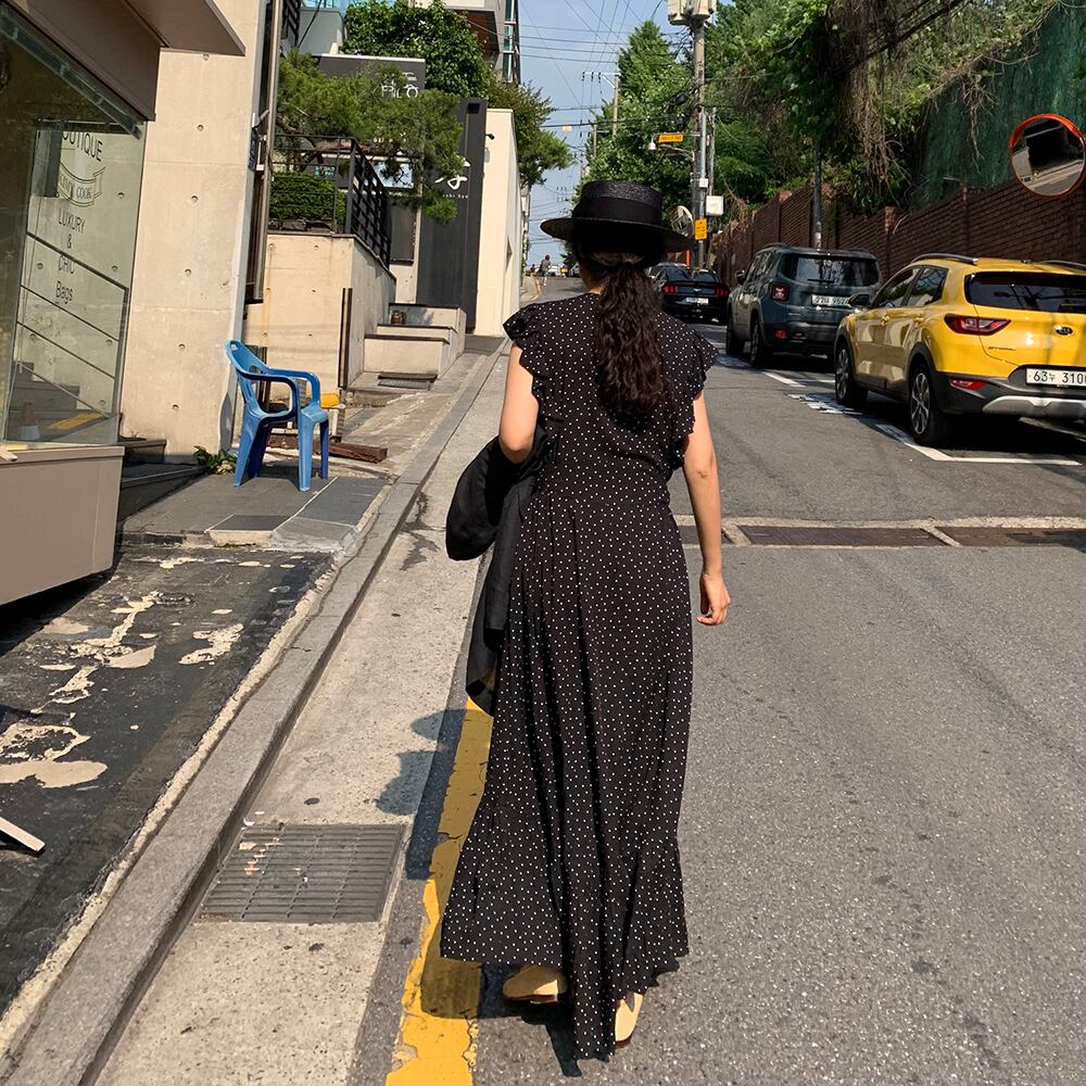 Vネック ドット柄 ワンピース フリルスリーブ ハーフスリーブ ロングスカート 韓国 シック 夏 レトロ ハイウエスト サマーワンピ a3041