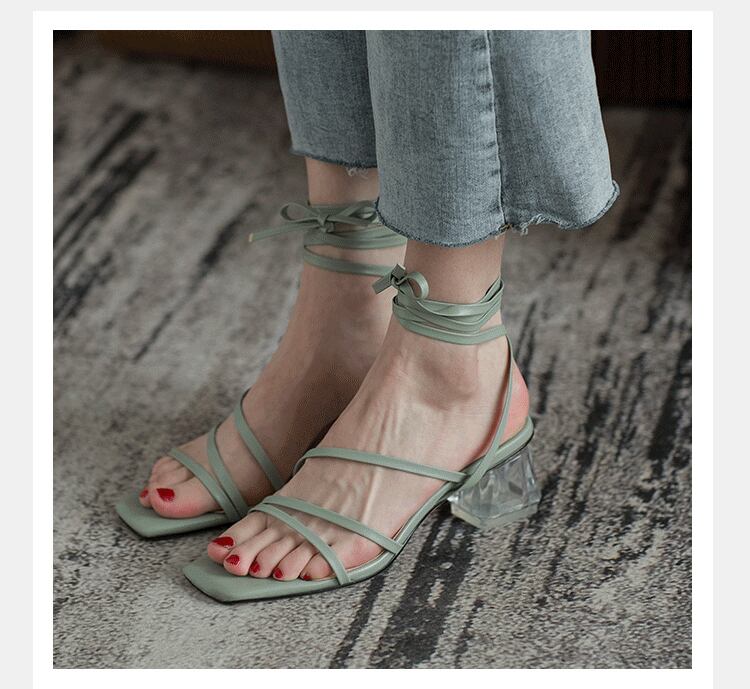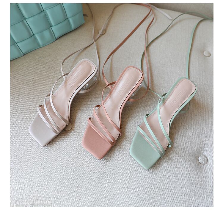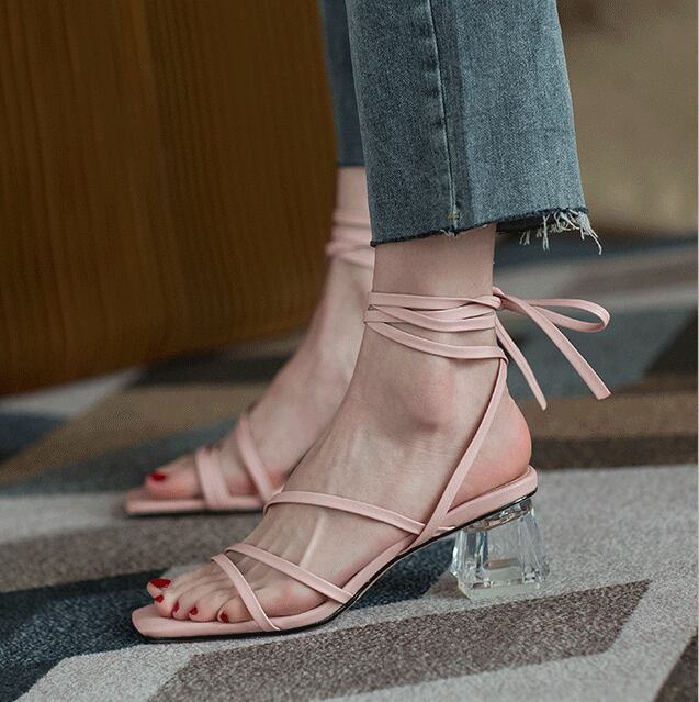 クロスストラップサンダル ミッドヒール クリアヒール クリスタル ハイヒール サンダル ミュール オープントゥ ヒール レースアップ 3カラー a3096