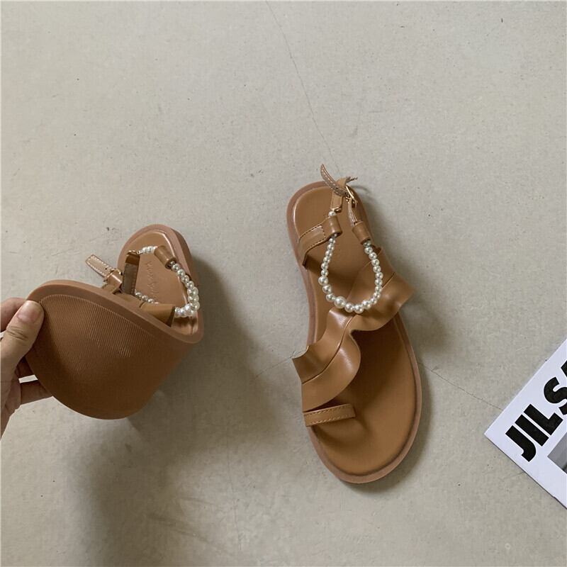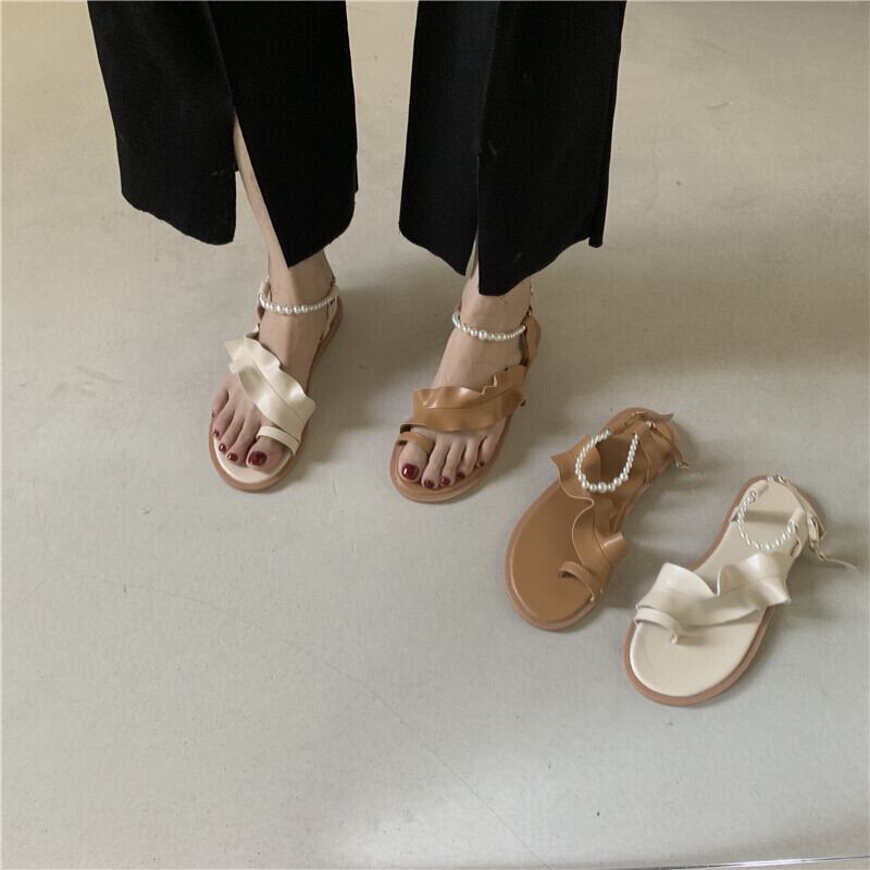 パールストラップ フラットサンダル アンクルストラップ ワンワードバックル フリップトゥ 3カラー a3116