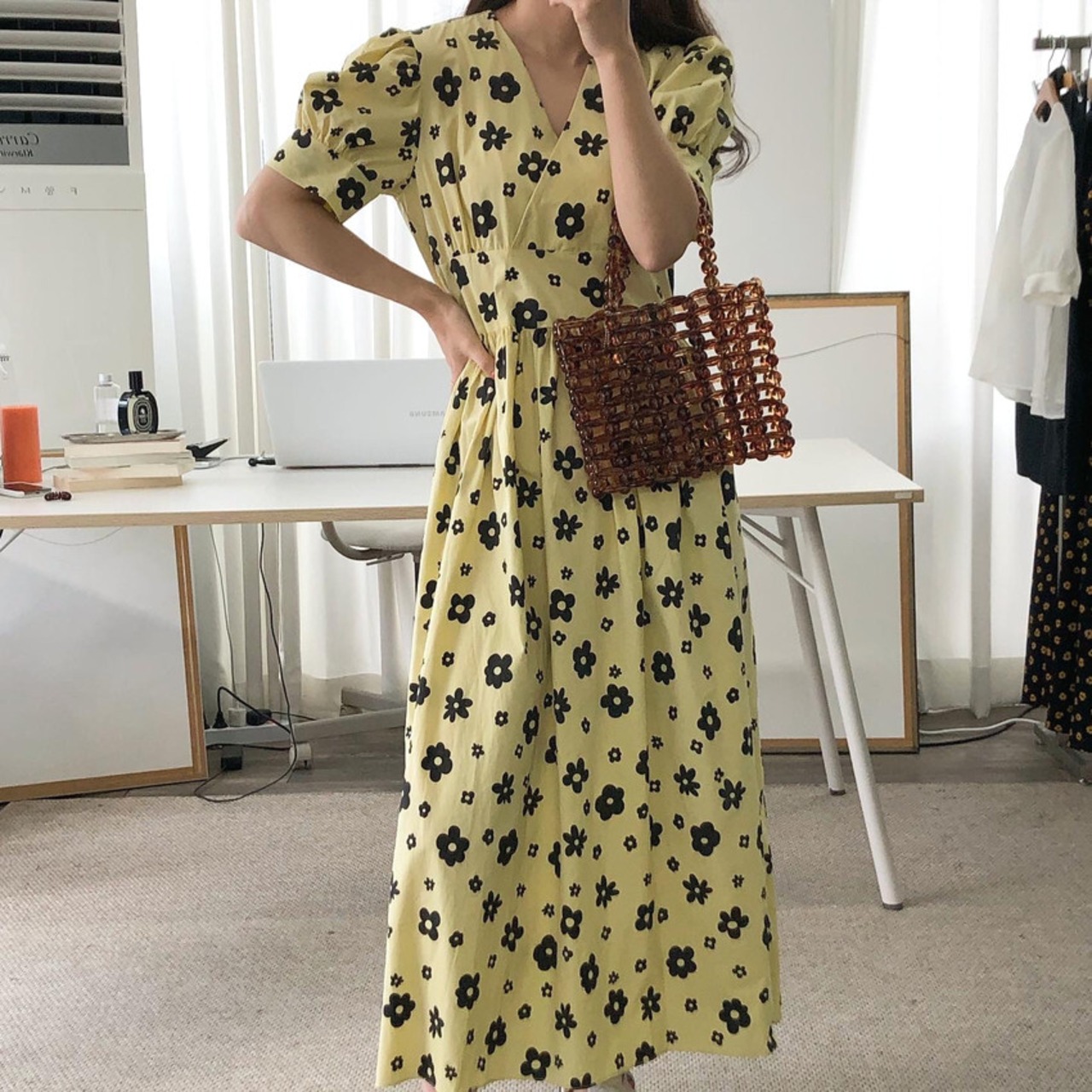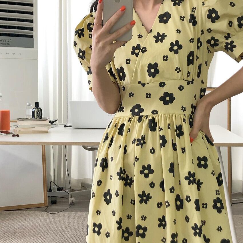 Vネックフラワーワンピース 花柄ワンピース パフスリーブ ワンピース 半袖 ロング ドレス プリーツウエスト 夏 エレガント 韓国 シック 2カラー a3114