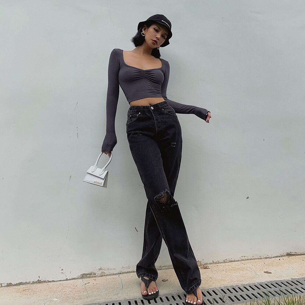 ダメージストレートジーンズ ハイウエスト ストレート ジーンズ デニム レトロ パンツ ボトムス レトロ 2カラー a3080