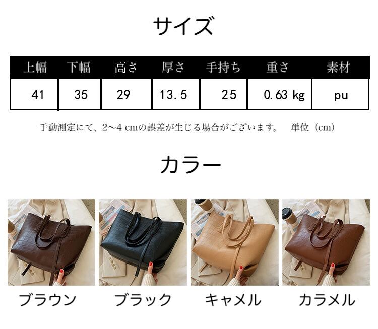 クロコダイル型押し 大容量トートバッグ ハンドバッグ トートバッグ シンプル PUレザー ビジネスバッグ バッグ bag 4カラー a3085