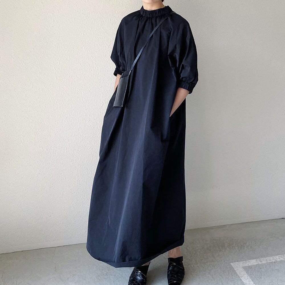 プルオーバー ロングワンピース ハーフネック ルーズ ワイドワンピース ワンピース バックジッパー 無地 七分袖 3カラー. a3150