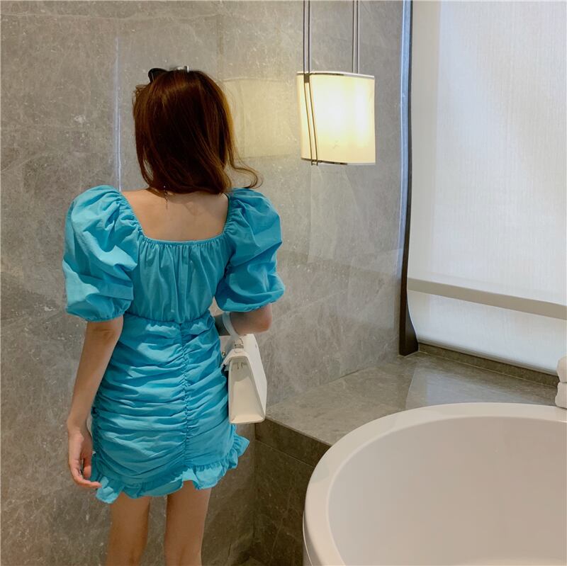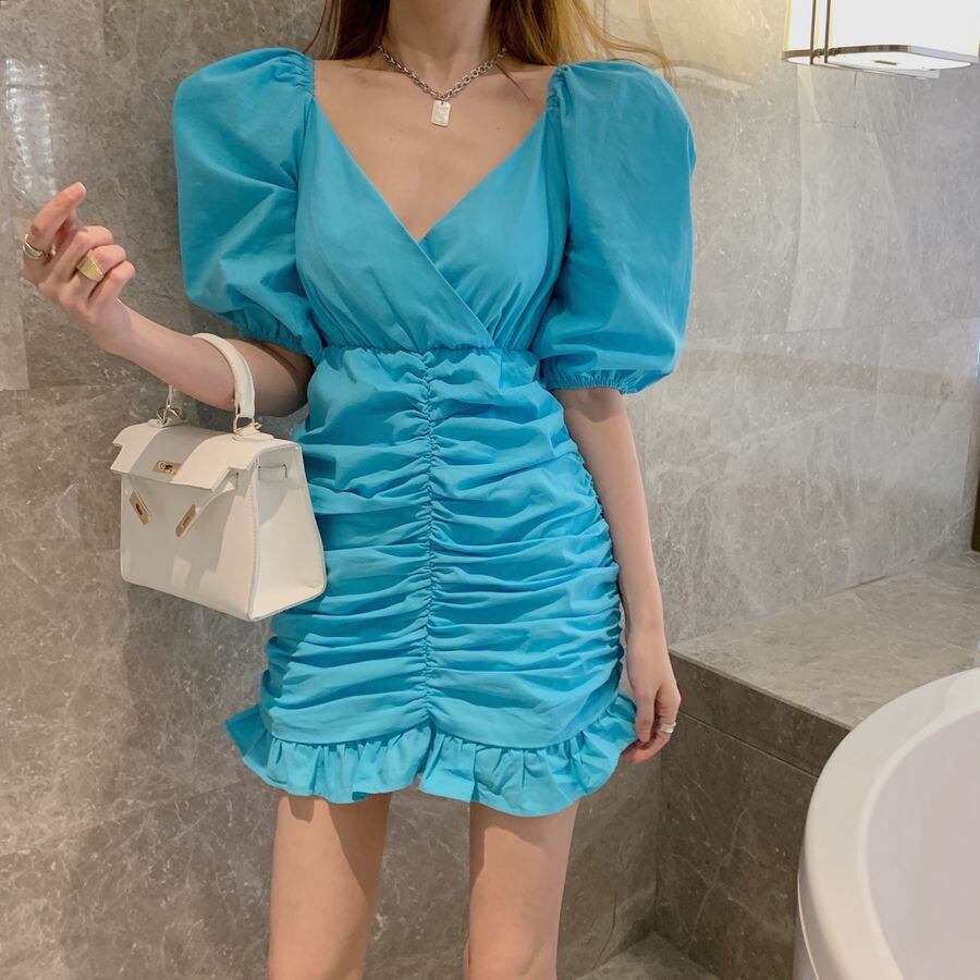 Vネックプリーツワンピース パフスリーブ フリルドレス フランチ レトロ ワンピース ドレス ミニワンピ 2カラー. a3167