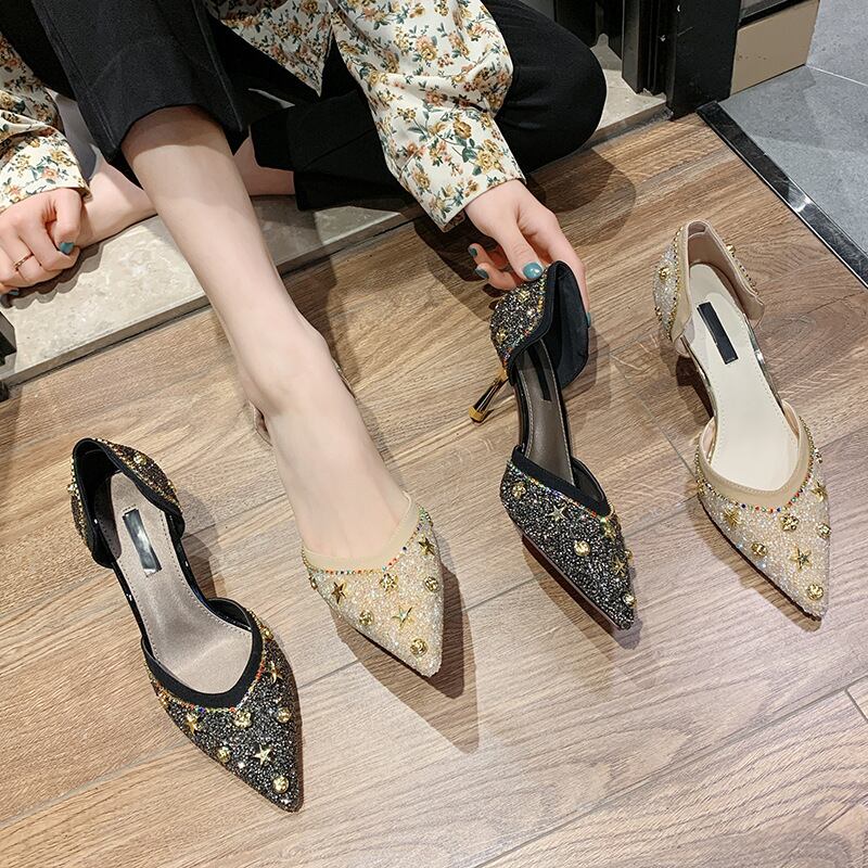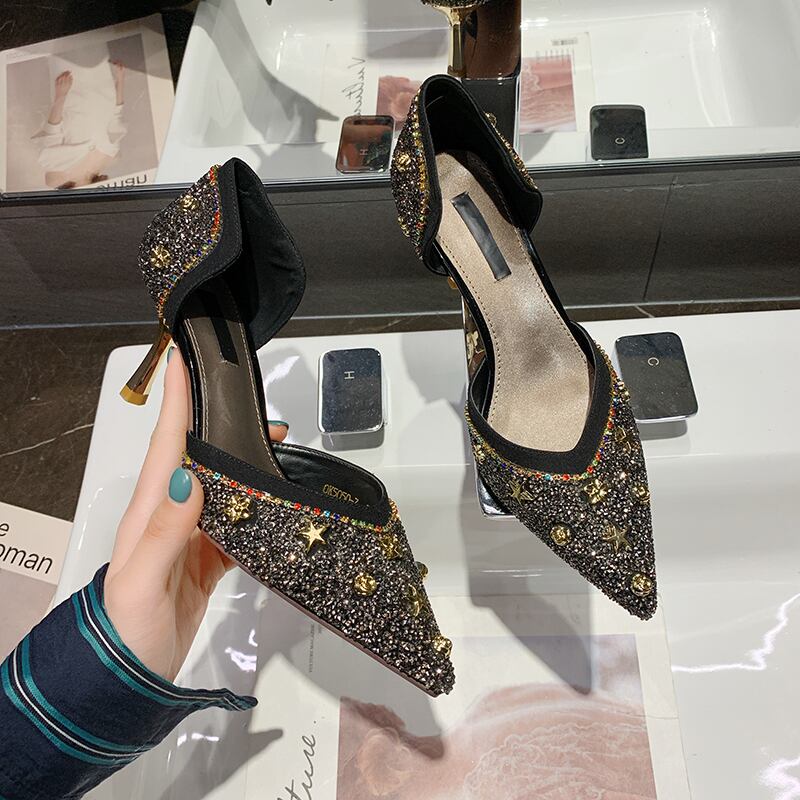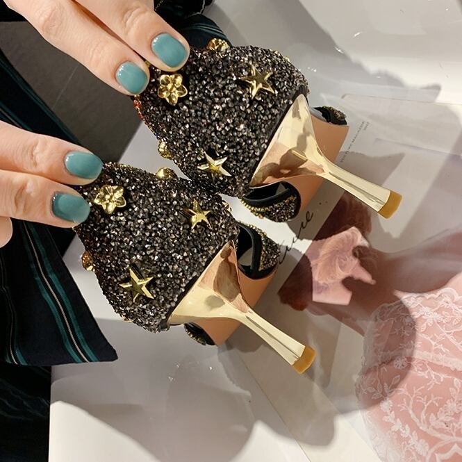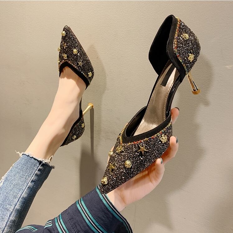 ラインストーンハイヒール ポインテッドトゥ ハイヒール パンプス ヒール パーティー 2カラー a3211