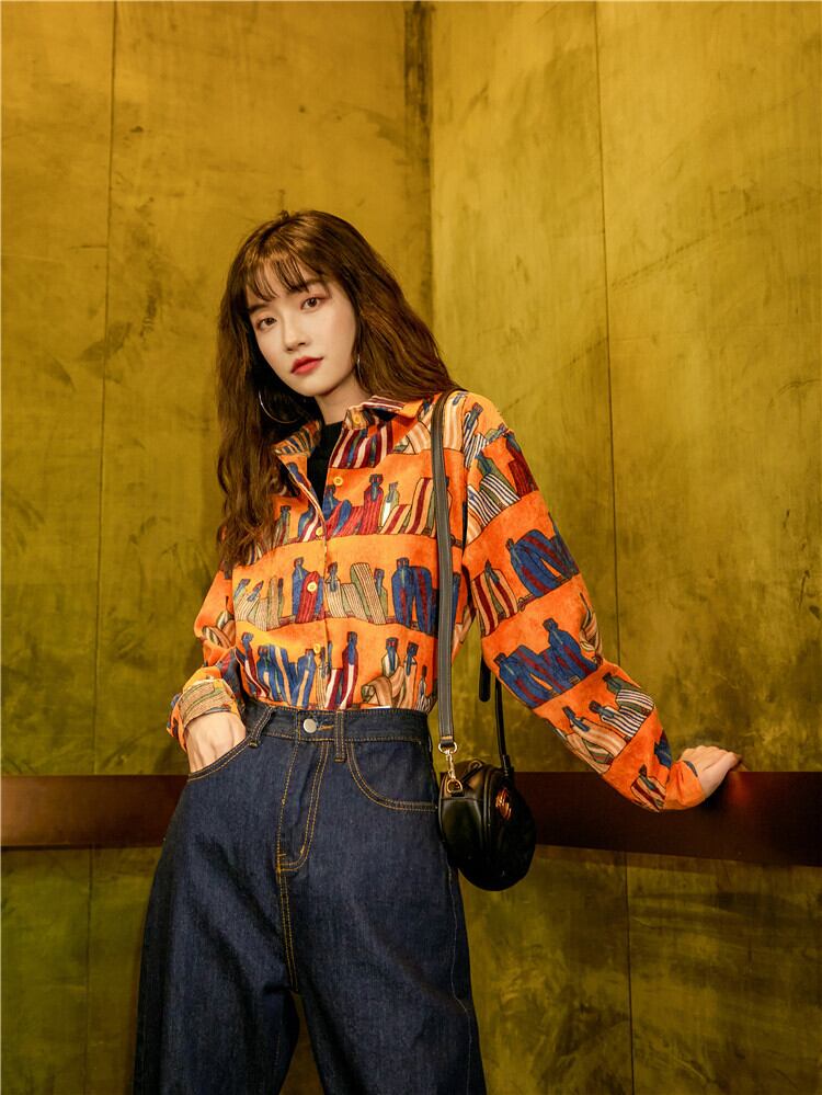 コーデュロイシャツ 長袖シャツ プリント ジャケット レトロ ウエスタンスタイル 秋 冬 モード系 ルーズ 柄シャツ 古着女子 a3245