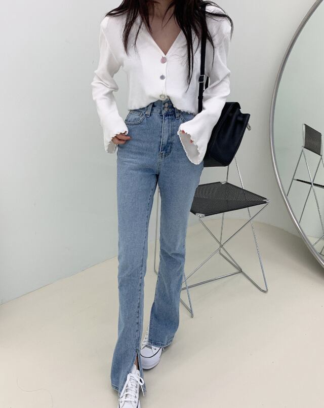裾部分にスリットが履いているストレートジーンズ
