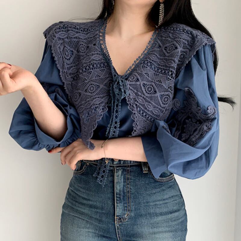 ビックカラー 刺繍レースブラウス パフスリーブ シャツ ルーズ ブラウス 韓国 長袖 3カラー a3310